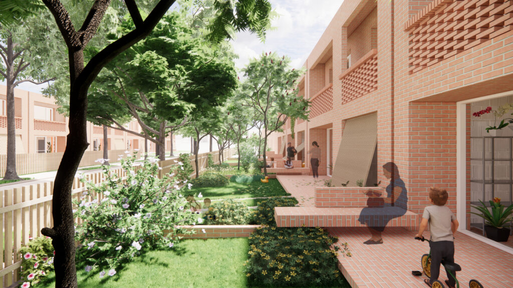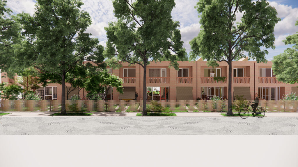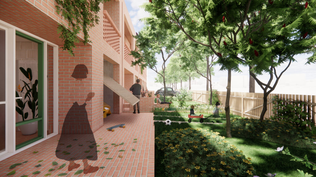 *Predná ´záhrada ´ je súčasťou širšieho zeleného predpolia za plotom / vlastníctvo medzi parcelami je jasne stále definované vytýčením v podobe nízkeho múrika /, spredu lemovaného alejou vzrastlých stromov v záhonoch na ulici. Táto severná záhrada je rozšírená smerom k ulici / nie je to nutné, ale skôr poukazujeme na možnosť za predpokladu odkúpenia časti pozemku od mesta – má to viaceré pozitíva, mesto sa nemusí starať o rozsiahly verejný priestor – pojme ho vlastník, susedia majú tak možnosť vytvoriť si otvorený objemný zelený priestor so vzrastlou zeleňou (parkové stromy aj ovociny ) a získať kontrolovanú upravenú otvorenú komunitnú záhradu / park. Pri dohode už 2-3 susedov dostáva toto predpolie potenciál malého parku. Na chodníku ostal stále priestor aj na zasadenie aleje stromov so záhonmi. Ľudia by mohli byť motivovaní parkovať autá v garáži, mimo ulice či záhrady…kde sa deti vedia aj zahrať. Predzáhradka tak nie je nemusí byť zbytkový priestor, ale súčasťou živej ulice, ktorá je zapojená do každodenného kolobehu.