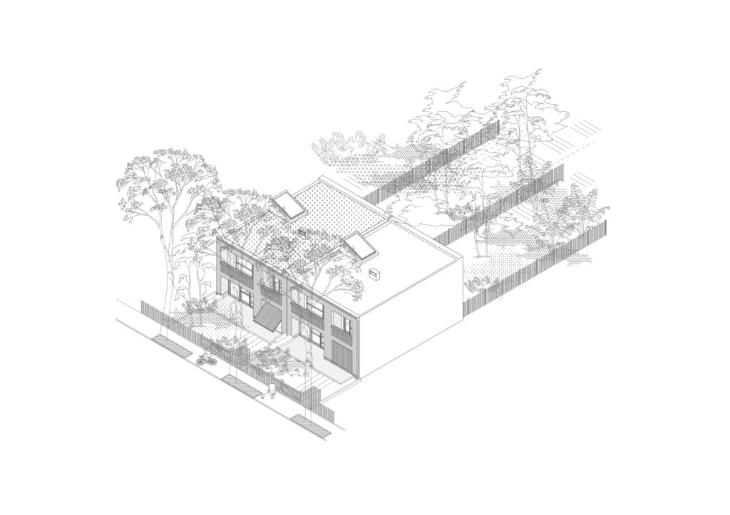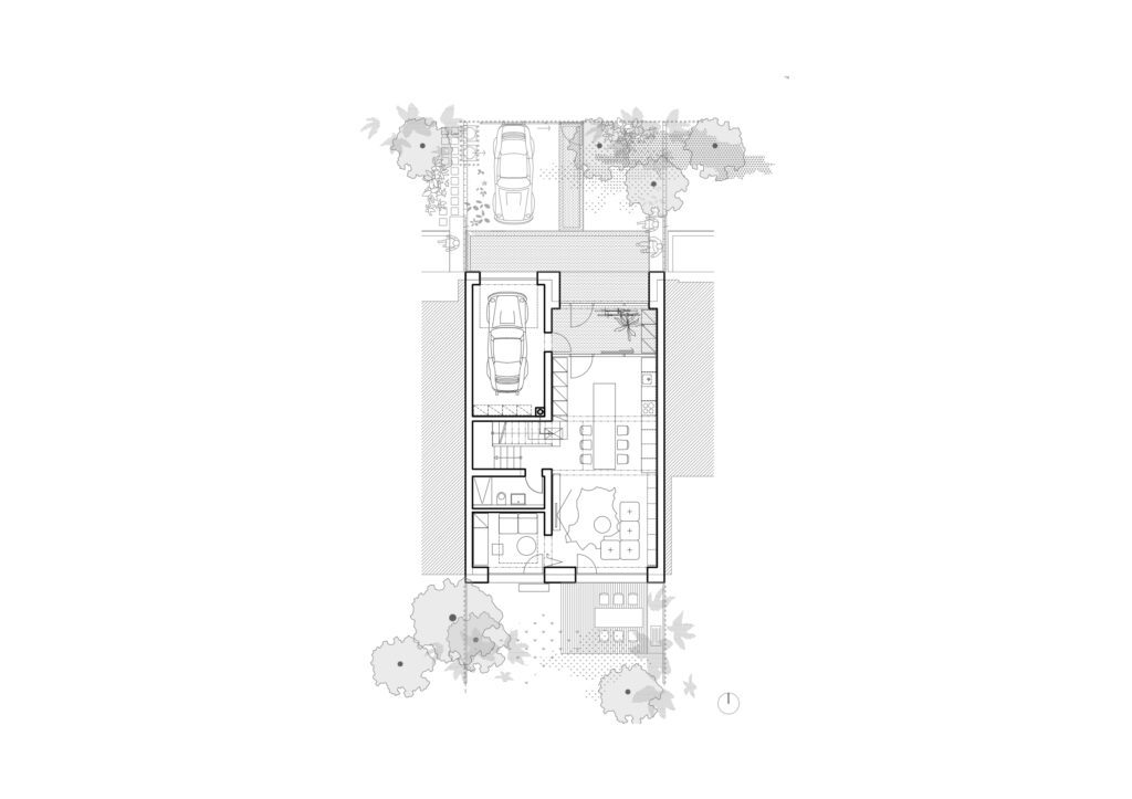 Ulica je pre nás dôležitá. Novoprofilovaný chodník delí od predzáhradiek drevený nižší latkový plot – uličná čiara. V ňom zakomponované odpadové nádoby. Predná záhrada* poskytuje priestor stretávania a zvítania rodiny ako aj susedov. Mimo zelenej časti pred domom zachovávame vstupnú niku, avšak táto je súčasťou prednej terasky v materiály fasády. Dôležitým prvkom je aj lavica – ako priestor pre neformálny oddych.