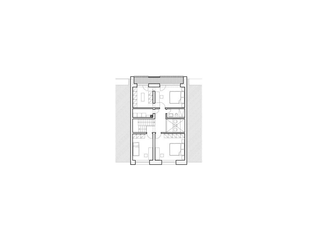 Navrhujeme teda tehlovú predsadenú stenu k zaizolovanej obvodovej konštrukcii. Fasády jednotlivých domov sú jasne oddelené vertikálnou štrbinou, do ktorej možné vsadiť dažďový zvod – pohľadovo – rovnako je s ním možné uvažovať aj v novej polohe jadra vnútri dispozície.