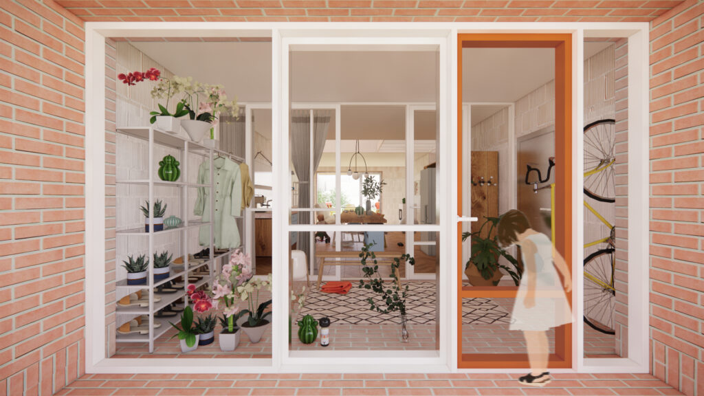 Fasáda. Uvažujeme o zjednotení fasád domov v rade – systémovo – rovnakým spôsobom. Tvaroslovie odporúčame rovnaké, v prípade potreby odlíšenia navrhujeme napr. každý dom môže mať inú farbu rámu vstupných dverí , alebo vstupný filter môže operovať s rôznym typom zasklenia – ornamentálne sklo, drátosklo vo vnútornom skle izolačného 3skla . Ďalšou možnosťou je jednoducho na maľovať časť fasády domu – priamo na nový tehlový plášť domov – zostane textúra drážok špár, a domová fasáda bude pôsobiť stále jednotne. /napr. ako je to pri Atlas house _atelier Monadnock /