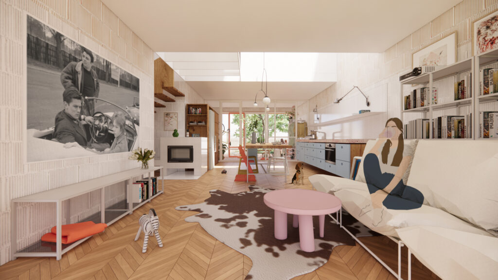 …po naštudovaní podkladov, sme zistili, že máme na stole dom, ktorý má v podstate nadčasovú – dobrú dispozíciu. Rozhodli sme sa, že budeme uvažovať o 4člennej rodine. Rodičia, občasne pracujú z domu, navštevujú ich zároveň starí rodičia. Rodina , ktorá sa rozhodla bývať v dome, ktorý poskytuje komfort veľkého bytu, ale má kontakt s ulicou, so zeleňou, so susedmi.